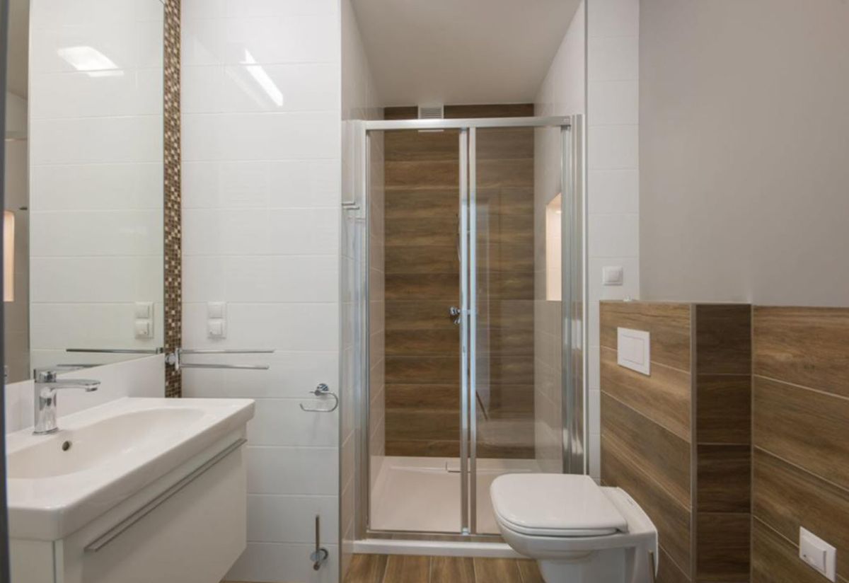 Każdy apartament wyposażony w aneks kuchenny, łazienkę i balkon lub taras.