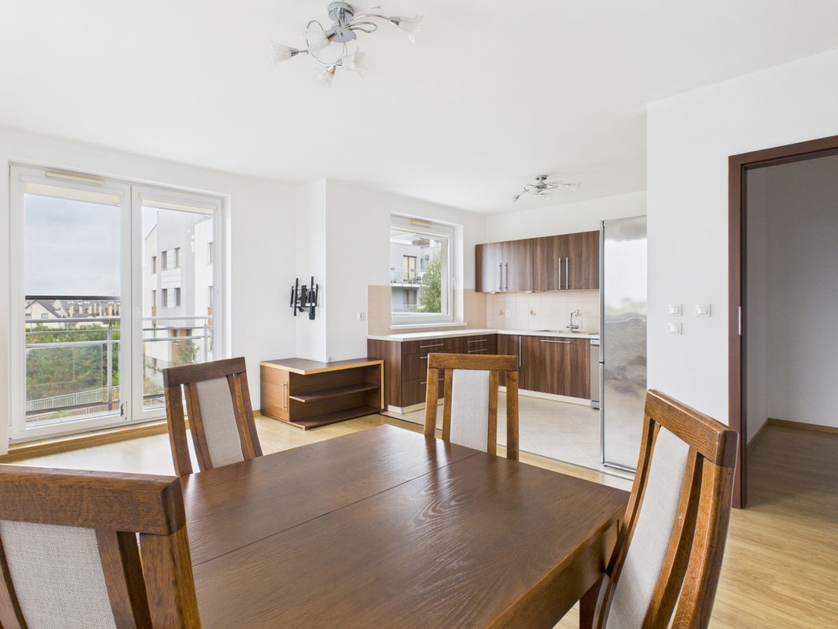 - Przestronny salon z aneksem kuchennym i wyjściem na balkon (północno-wschodnia ekspozycja) - idealne miejsce na poranną kawę lub spokojny wieczór.