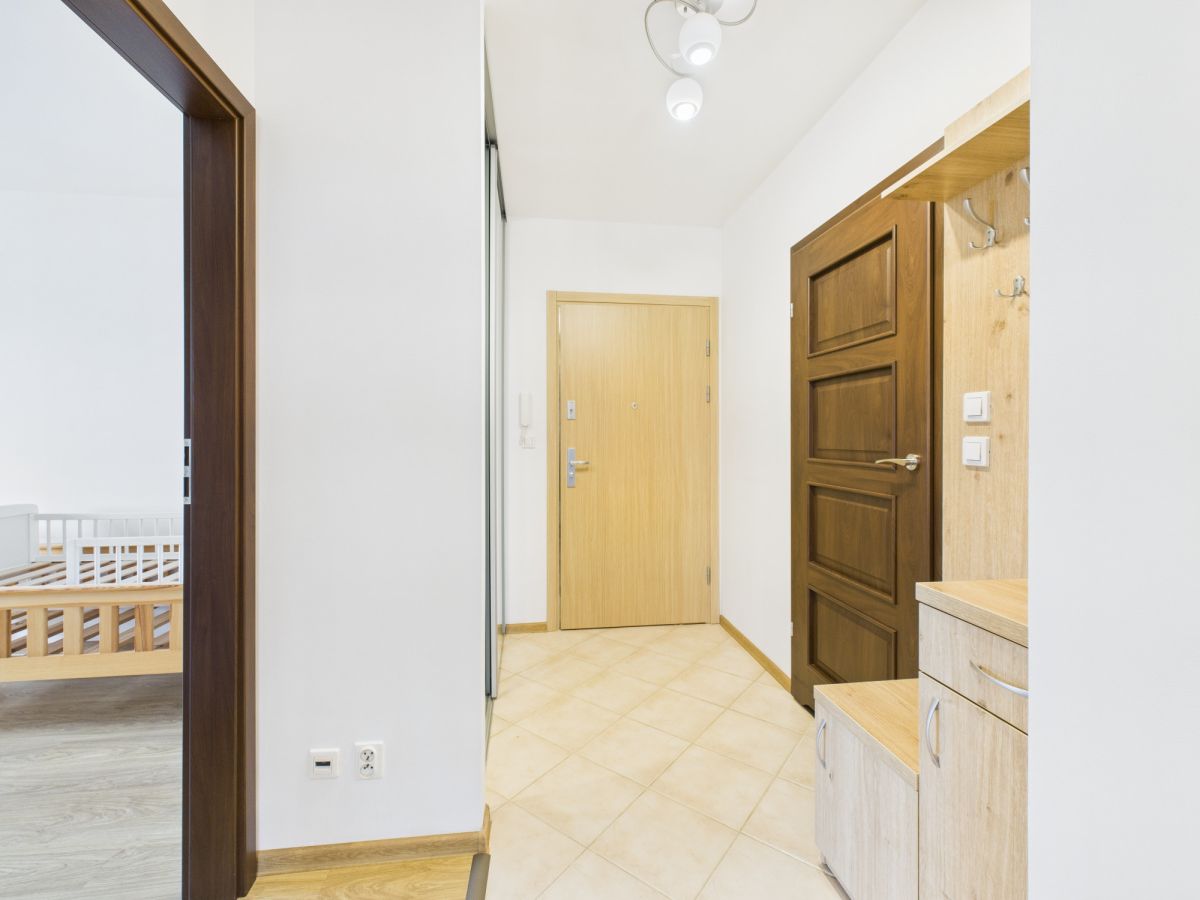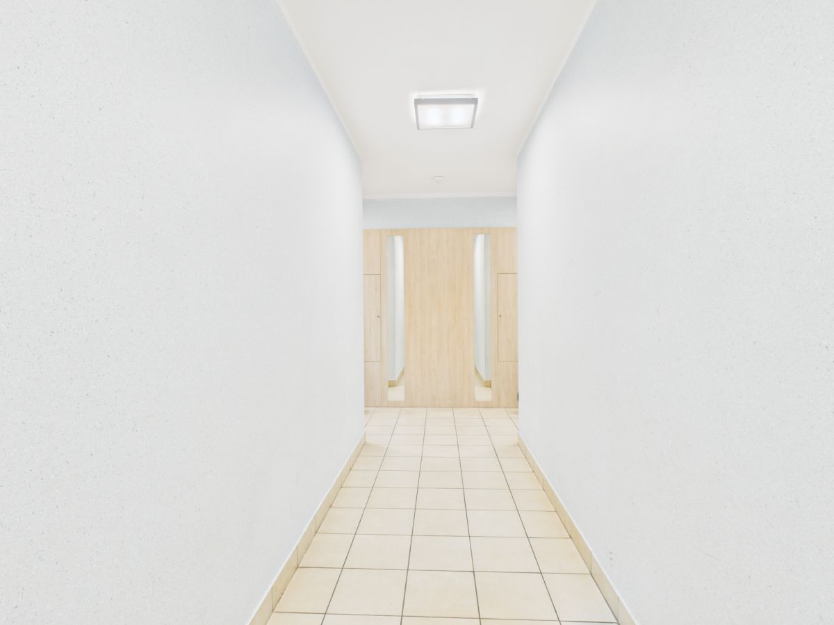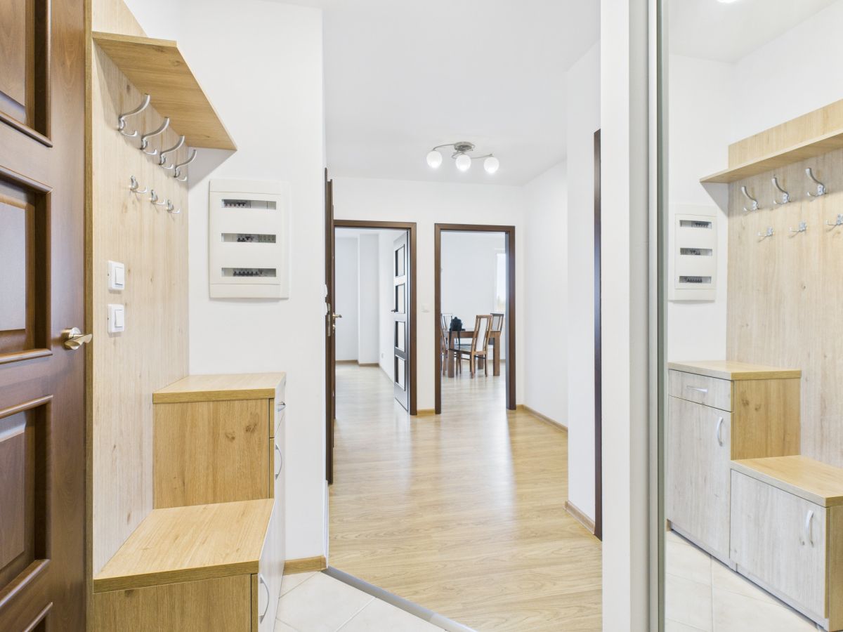- Przedpokój z miejscem na zabudowę i dużym lustrem optycznie powiększającym przestrzeń.
